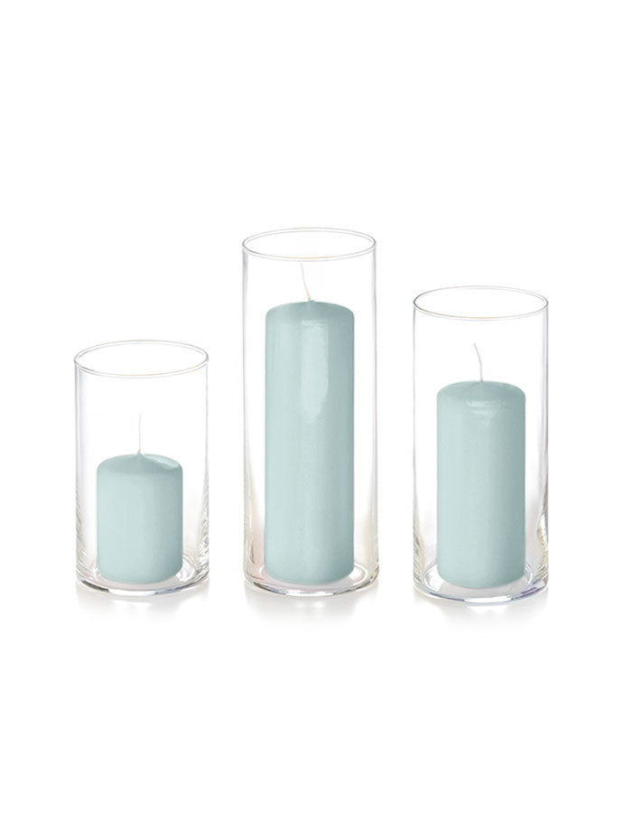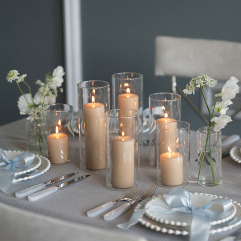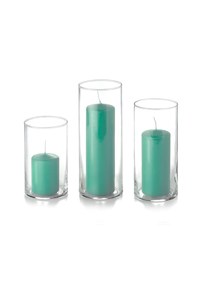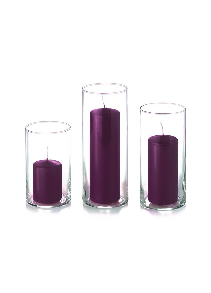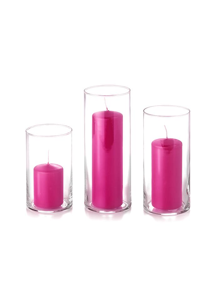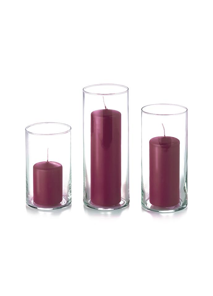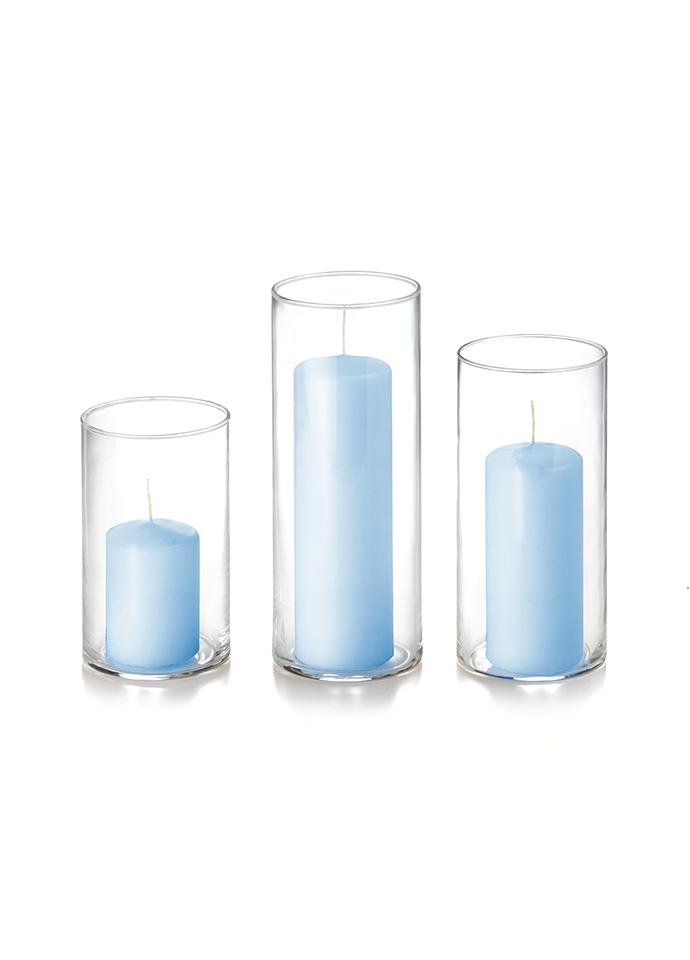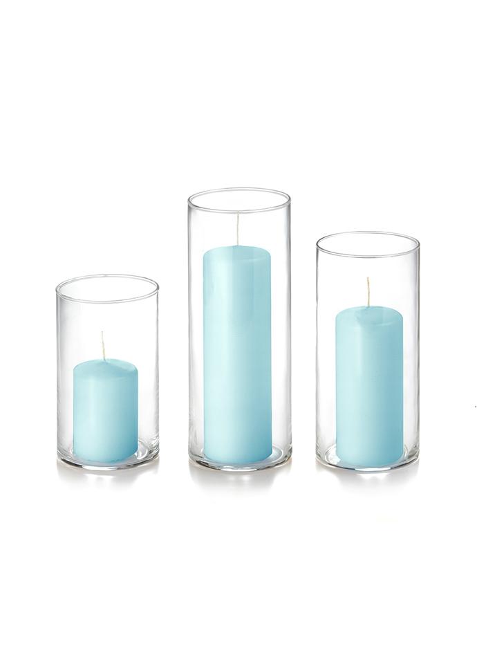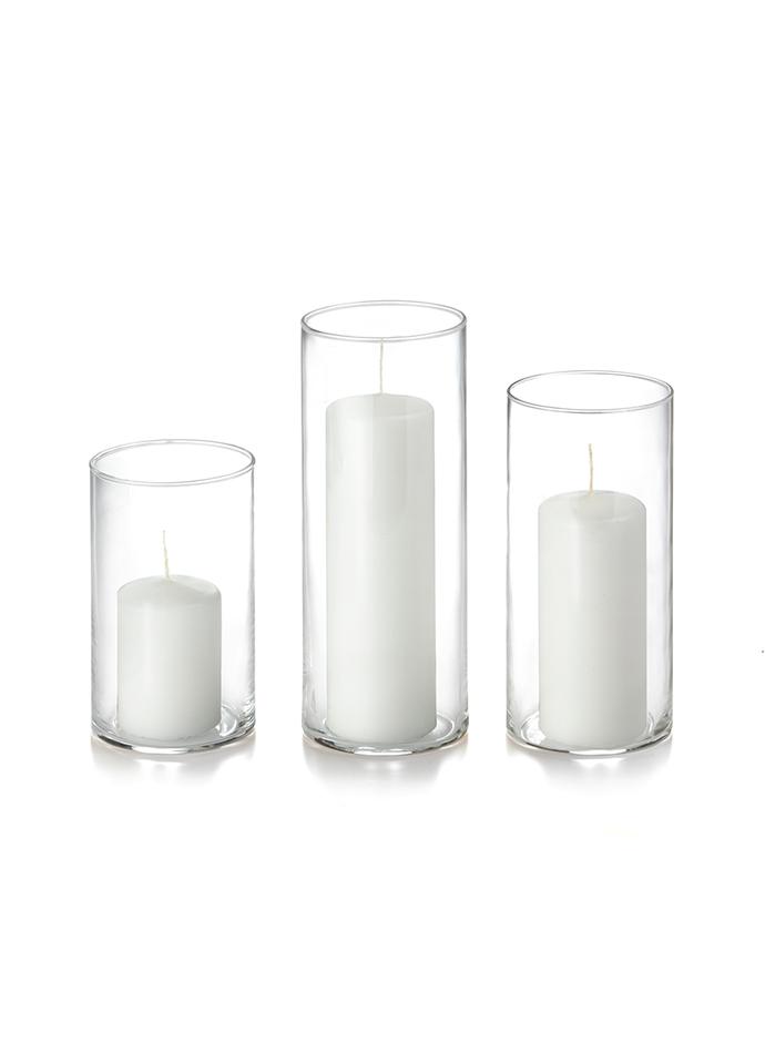 Let us help you to take the guess work out of designing the ultimate event centerpiece. This high quality premium offering cannot be matched in value or versatility. Our legendary Slim Pillar Candles are well known for their long burn time and consistency, making this centerpiece arrangement ideal for that special occasion. Regardless of the event you can create a distinctive atmosphere and ambience with the shimmering glow of candlelight. What’s more, this particular slim pillar candle cylinder vase set is affordable and ideal when designing on a budget.