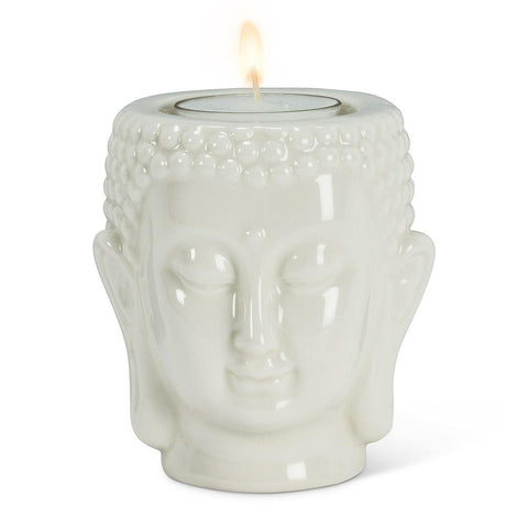 Add ambiance and tranquility to any setting with this serene Buddha Head Tealight Holder. Crafted out of porcelain, this detailed Buddha head sculpture in white fits most tealights easily to bring a touch of Zen wherever you place it. Candles sold separately.